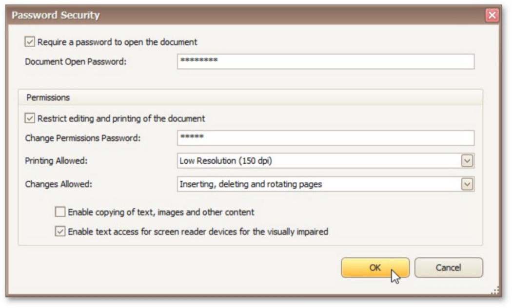These options allow you to adjust the security options of the resulting PDF file (e.g. enable open document, editing, printing and copying protection, and specify which changes are allowed).